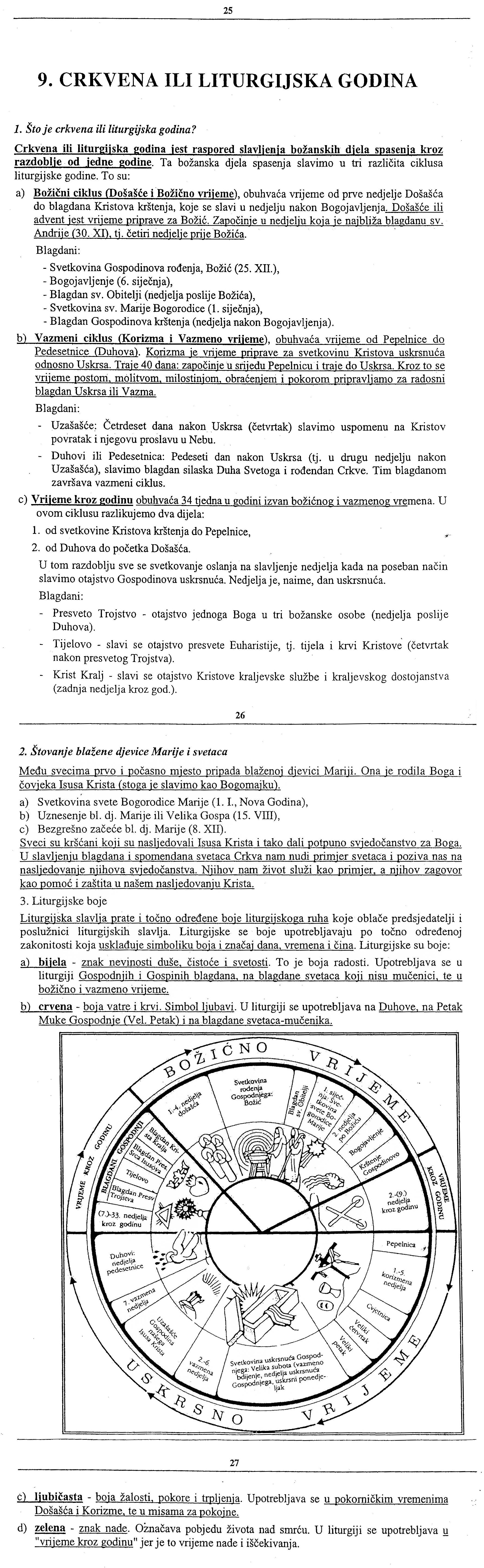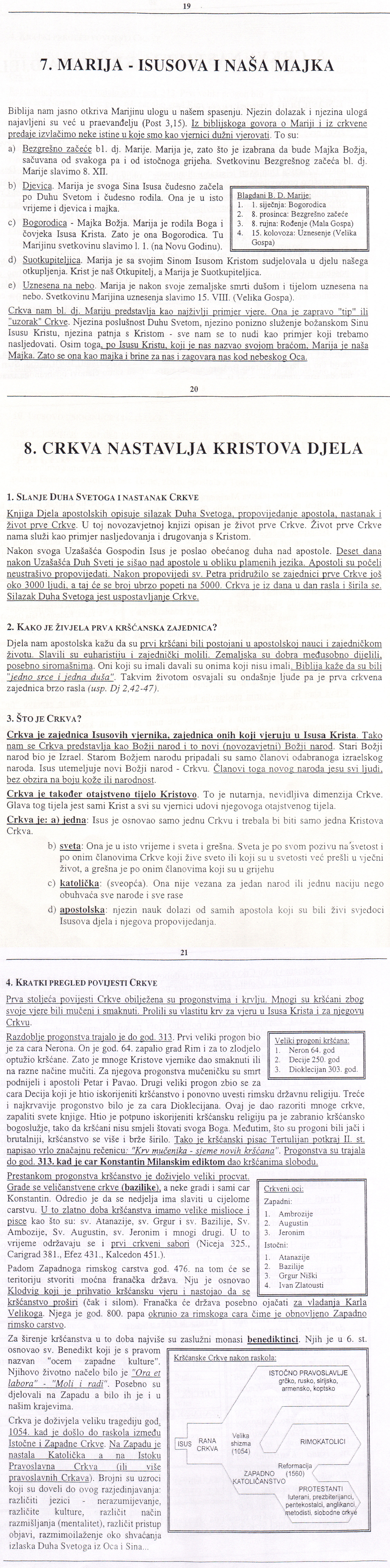 1. Što je misa ili euharistija? Možemo jednostavno opisno reći: mi kršćani sastajemo se redovito nedjeljom jer je to za nas kršćane dan Gospodnji-Isusov dan (Isus je toga dana uskrsnuo) da činimo onu jednostavnu gestu-čin s Isusove oproštajne večere. Isus je tada uzeo kruh, zahvalio Bogu, razlomio kruh i dao ga učenicima uz riječi: uzmite i jedite – ovo je Tijelo moje koje se za vas predaje. Tada je uzeo čašu s vinom, ponovno zahvalio Bogu i dao učenicima uz riječi: uzmite i pijte iz nje svi – ovo je čaša moje krvi, novoga Saveza, koja se prolijeva za vas i sve ljude na oproštenje grijeha. Tada je još dodao: ovo činite meni na spomen. 2. nazivi: euharistija = zahvaljivanje; misa = poslanje; večera Gospodnja – jer je ustanovljena na posljednjoj večeri; lomljenje kruha – po Isusovoj gesti lomljenja kruha To je euharistija. Možemo to reći i drugačije: euharistija je spomen-čin kojim se na znakovit (sakramentalan) način vrši naše spasenje. U euharistiji se spominjemo (slavimo) Isusove muke, smrti i uskrsnuća. Euharistija je najjasnije očitovanje Kristove nazočnosti među nama. 3. Euharistija je bogata značenjem. Da bismo je dublje proniknuli treba je promatrati pod različitim vidovima (prema riječima iz izvještaja o ustanovi euharistije). Možemo reći: a) euharistija je zahvaljivanje: to joj znači i samo ime. Znamo da je Isus često zahvaljivao (i slavio) Bogu. Tako i na posljednjoj večeri kad je izrekao blagoslov i zahvalu nad kruhom i vinom. Mi u euharistiji zahvaljujemo Bogu za cjelokupno djelo spasenja koje je Isus ostvario svojom mukom, smrću i uskrsnućem. b) euharistija je izraz vjere skupljene zajednice. Upravo po euharistiji povezani smo s Isusom Kristom, sabrani smo u njegovo Ime i time priznajemo da smo vjernici. Zanimljivo je da se pričest na latinskom naziva communio-zajedništvo. Euharistija ima komunitarnu dimenziju: povezani smo s Kristom u vjeri, ali i međusobno. Zato pravi kršćanin ne može živjeti bez euharistije. c) euharistija je žrtva. To vidimo iz Isusovih riječi: ovo je Tijelo moje koje se za vas predaje i krv koja se za vas prolijeva. A to su žrtveni termini i izražavaju nasilnu smrt. Zato euharistiju nazivamo nekrvna žrtva: Isusova žrtva događa se na sakramentalan način. Lomljenje kruha u euharistiji označuje Isusovu nasilnu smrt. Isusova smrt na križu bila je krvna žrtva: Isus je tada umro upravo od iskrvavljenosti. d) euharistija je gozba. Isus kaže: uzmite i jedite… pijte. Nije rekao: gledajte me, klanjajte mi se… Prema tome, euharistija za mene kao kršćanina nije cjelovita ako ne idem na pričest (primanje Tijela Kristova). Isus nam je rekao: ako ne jedete Tijela Sina Čovječjega i ne pijete Krvi njegove – nemate u sebi života (v. Iv 6,53). To mnogi kršćani ne shvaćaju i misle da je moguće biti kršćanin a da se ne ide na pričest. Isus misli i govori da to nije moguće! e) euharistija je novi Savez. Staro Savez Bog je sklopio s Izraelcima u pustinji, nakon oslobođenja iz egipatskog ropstva. Ovdje se radi o novome Savezu koji je sklopljen u Kristovoj Krvi. Bog nam je, dakle, Saveznik, a ne protivnik! f) Isus na kraju kaže: ovo činite meni na spomen. To znači dvoje: – da slavimo euharistiju – i to činimo u dan Gospodnji-nedjeljom. Ne činimo to iz zakona, običaja – nego iz povjerenja i ljubavi što nas sam Isus na to poziva; – ono što je Isus živio i činio – životom ljubavi, predanja, sebedarja – upravo TO želi da činimo ili živimo njemu na spomen! Tu se radi o novoj kvaliteti života. A to znači: ono što smo slavili i sakramentu činiti u svom životu. 4. Euharistija kao obred sastoji se iz nekoliko dijelova. Kratko spomenimo: a) uvodni obredi: znak križa, pozdrav, pokajnički čin, zborna molitva; b) služba Riječi: čitaju se odlomci iz Svetoga pisma, mi na tu riječ odgovaramo slušanjem, pjevanjem, molitvom, ta nam se riječ u propovijedi protumači, te ovaj dio završavamo ispoviješću vjere i vjerničkom molitvom; c) euharistijska služba: to je služba zahvale. Donose se na oltar kruh i vino, izražava se slavljenje Boga, kruh i vino posvećuju se Isusovim riječima – postaju Tijelo i Krv Kristova (to nazivamo pretvorba), izričemo Gospodnju molitvu (Oče naš), pružamo mir jedni drugima, pristupamo pričesti – primamo Tijelo Kristovo; d) završni obredi: blagoslov i otpust vjernika. 5. Pričest je primanje Tijela Kristova. Možemo se pričestiti na jezik ili na ruku. Kad se pričešćujemo svećenik nam kaže: Tijelo Kristovo, a mi odgovorimo: Amen (to znači: vjerujem). Bilo bi najlogičnije da pričesti pristupimo svaki puta kad smo na misi (smijemo 2 puta na dan). Na pričest smijemo ići ako nemamo teškoga grijeha. Ako smo teško sagriješili (npr. opsovali Boga, tada se prije pričesti moramo ispovjediti). 6. Na euharistiji bi trebalo sudjelovati pažljivo, aktivnim slušanjem, razmišljanjem, molitvom, pjesmom. 7. Uvijek se običavalo jedan dio posvećenih hostija (Tijelo Kristovo) čuvati da bi se kršćani mogli i izvan mise moliti i klanjati Isusu Kristu i da bi se pričest mogla nositi bolesnicima. Posvećene hostije čuvaju se na glavnom oltaru ili u blizini njega u tzv. tabernakulu (slično ormariću) i tu negdje u blizini uvijek gori intenzivno crveno svjetlo. To nam je znak na Kristovu nazočnost pod prilikama posvećenog kruha. Zato mi kršćani kad dođemo u crkvu pokleknemo na desno koljeno. Klanjamo se Isusu Kristovu – a ne kipovima ili slikama!